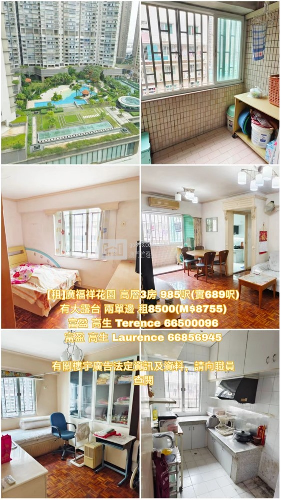 詳細介紹:[租]廣福祥花園 高層3房 985呎(實689呎) 有大露台 兩單邊 租8500(M$8755)